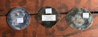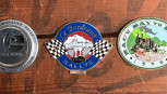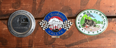 including a metal General Motors 'COMMEMORATIVE RALLY - 50 ANNIVERSARY IN AUSTRALIA 1926-1976' badge, a Badgers Australia 1998 'RACV BAY TO BROOK' badge, on brass with enamelled locomotive, motorbike and vintage car picture to front, 1996 'Le Bordeaux RALLYE' Bradford Badge Suppliers on brass, enamelled central picture to front, chequered flags with mounting holes; largest badge with diameter of 9cm. -