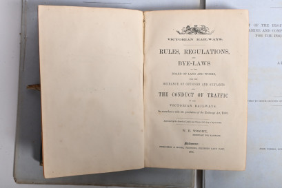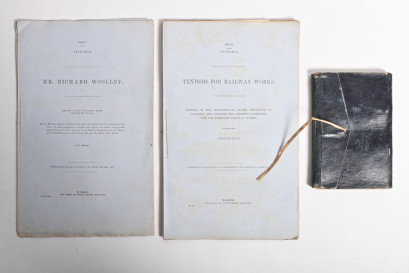 including a black leather bound issue of 'VICTORIAN RAILWAYS - RULES, REGULATIONS AND BY-LAWS' from 1864, 173 pages, slight water staining, rear of publication signed and declared by a William Killingsworth in 1864; with two reports from 1856-7 and 1857-8, first describing investigation into criminal charges against a Mr.Richard Woolley and second issued for 'TENDERS FOR RAILWAY WORKERS' -
