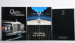 black covers, colour model pictures with sales narrative, engineering detail, model specifications to last page, a circa 1990 glossy, stiff portrait format, 32 page corporate brochure - 'Quality is Timeless' - featuring the quality and work that goes into RR & Bentley cars, together with another large format corporate brochure - 'Pride of Britain, envy of the world' - an exploration into the craftsmanship involved with the creation of Rolls-Royce motor cars, with historical engineering time line to rear, brochure with 24 pages. -