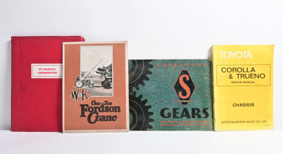 covering various themes including 'PLYMOUTH LOCOMOTIVES' information kit with various Plymouth Locomotives manuals and brochures, 1980 TOYOTA COROLLA & TRUENO REPAIR MANUAL' - CHASSIS' (Publication No.98179), manual details inspection and repair methods for the Toyota Corolla and Trueno series chassis, multi-sectional, 'W&K One-Ton Fordson Crane' booklet, booklet with various Fordson application pictures, specifications to rear; and one other. -