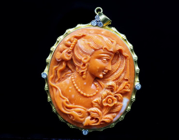 Lot Description:Large coral cameo set 18ct yellow gold & diamond pendant