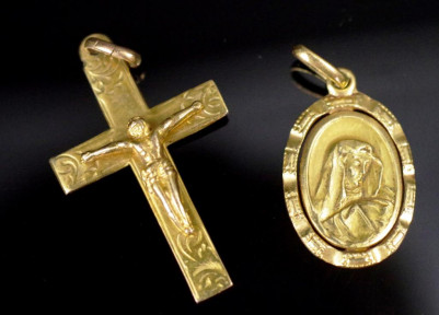 includes: marked 9ct gold Crucifix 1.78 grams, 18ct yellow gold Madonna marked 750 1.29 grams -