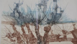 Two coloured etchings and another Lithograph, largest approximately 24cm x 48cm. -