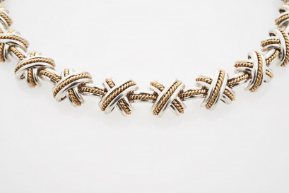 18ct yellow gold and sterling silver designed with solid 'X' links with a gold roped thread to the centre, together with a pair of large matching earrings fitted with silver French clips, signed Tiffany and Co, 1990, 925, 750