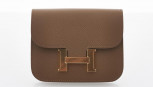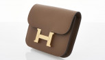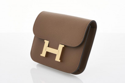 etoupe Epsom calfskin, gold hardware, tonal leather to interior with two card slots and one compartment to centre, leather belt loop to back, pristine with care book, dust bag and box