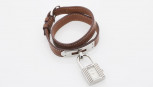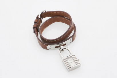 rectangular case in packlock shape, enhanced by brown Kelly Double Tour leather wristbrand, minor scratches to hardware, with carebook and box