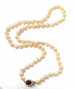 Lot Description:A Strand of Baroque Akoya Pearls, 9ct Yellow Gold Garnet & Pearl Clasp
