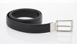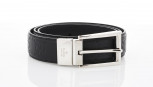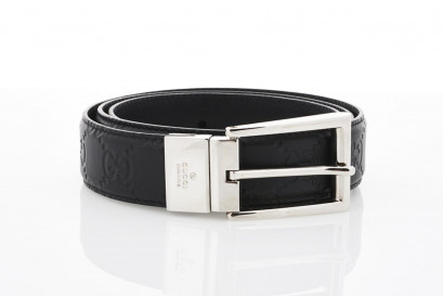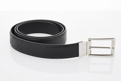 smooth black leather with Guccissima pattern throughout enhanced by rectangular buckle, silver tone hardware, with GG accent to one end, made in Italy (A/F)