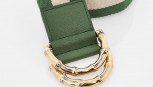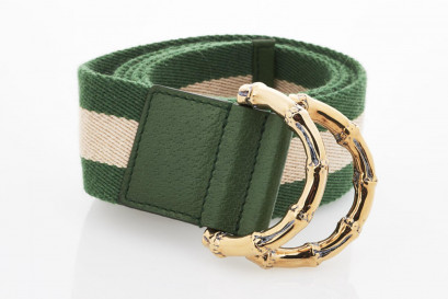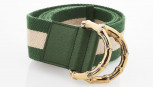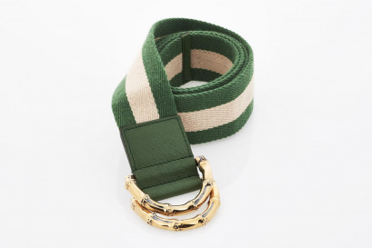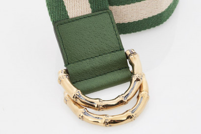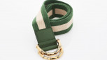 light gold and green web with slip lock buckle closure, gold tone hardware, stamped 'made in Italy'