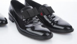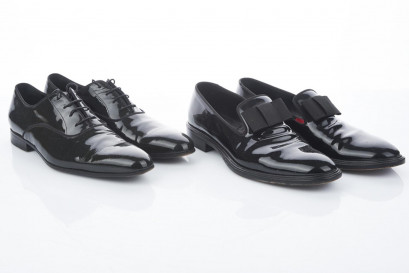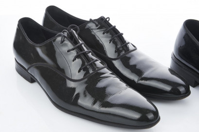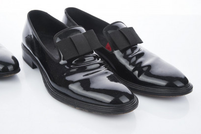 including a pair of Givenchy patent leather in the style of opera pumps, with textile bow-tie details to upper, red velvet insoles; together with a pair of patent black leather Lanvin Oxford, round-toe, closed lacing, heavy signs of wear (A/F)