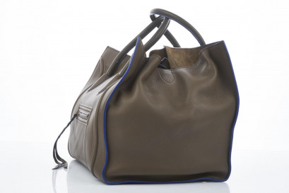 smooth taupe leather with royal blue trim and double top handles, aged gold tone hardware and front zip pocket, together with leather strap closure, interior tonal suede lining and zip pocket, stamped 'Celine Parisí