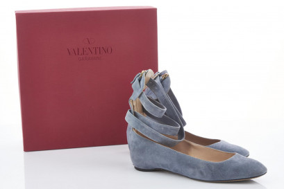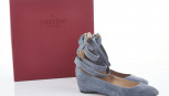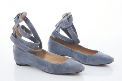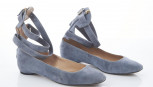 square toe, grey suede with adjustable lace-up ankle straps and back zip, leather-lined soles and insoles