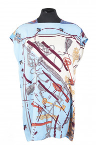 blue with key and tassel motif details in multicolour throughout, enhanced by square neckline, labelled 'Hermes Paris made in France'