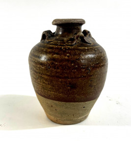 Lot Description:A Brown Glazed Stoneware Jar with Four Horizontal Ears, Constricted Neck, Flared Lip & Unglazed Lower Portion, Song Dynasty