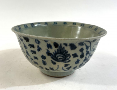 Lot Description:A Blue & White Footed Bowl with Central Lotus Motif, Character Detail to Rim & Expressive Peacock Detail to Outer Cavetto, Ming Dynasty