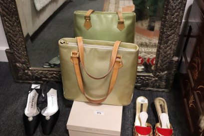 Lot Description:Louis Vuitton made in Spain Monogram Houston green/gold lustre bag with tan side straps