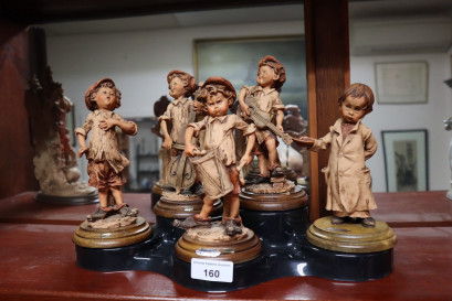 five children playing instruments and singing, on walnut-stained bases, all signed, with original black PVC stand, heights 18 to 20 cm.