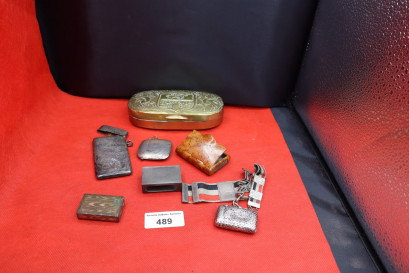 900 silver vesta with ribbons and silver mounts, 800 silver vesta, antique timber snuff box and other metal items
