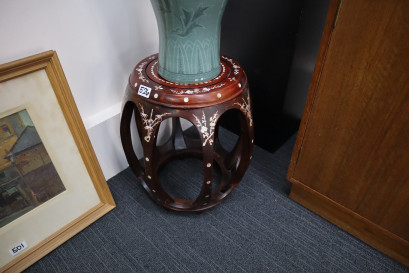 Lot Description:Oriental rosewood and mother of pearl inlaid drum stool