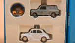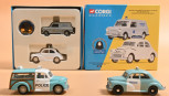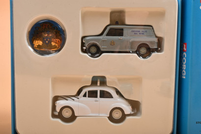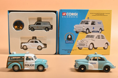 consisting of a Morris Minor & Mini Van, Morris Minor in white, black interior seats 'POLICE COURTESY PATROL' sign to roof, black chevrons to bonnet, Mini Van in grey with black interior, emblems to doors, 'STOCKPORT POLICE DOG PATROL' decals to van sides, blue siren to roof, numbered '01654' of 4,800 produced, CoA, original lift top box with inner packaging, with Morris Minor in light blue and white 'POLICE' livery, 'POLICE' sign to roof, black wheels, no box, together with Morris Traveller Van, blue/white body, wood panelling, 'POLICE' decals to doors, no box. -