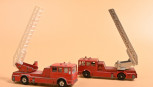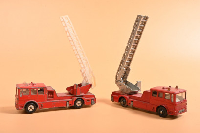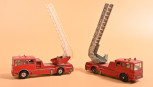 both red with white interiors, one with silver plastic extendable ladder (possibly painted), other with white ladder lacking extension, one example with black wheels; no boxes. -