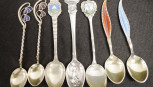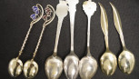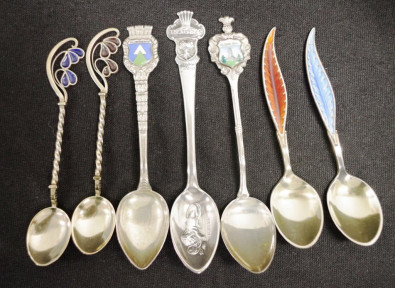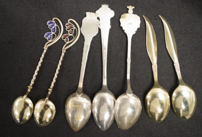 Four 925 enamelled spoons (28 grams) and two 800 silver spoons (20 grams) together with a Rolex Bucherer Watches spoon -