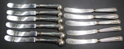comprising: set 6 pistol grip savoury knives, marked for Sheffield 1930; and set 5 Kings pattern savoury knives, marked for London 1929.
