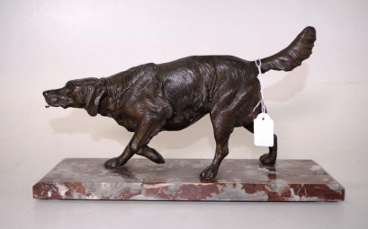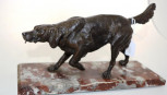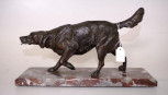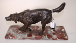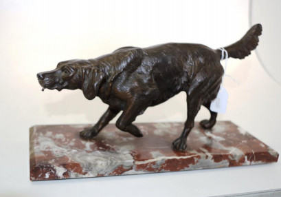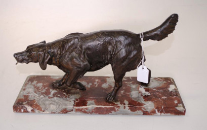 standing figure of a spaniel, (height16cm; length 30cm approx), with tongue form hook from mouth for suspending a fob watch, on a red marble base. -