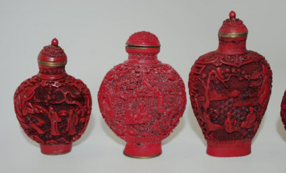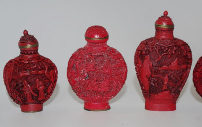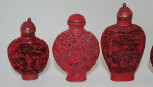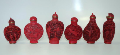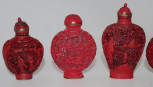 Lot Description:Group six Chinese cinnabar colour snuff bottles