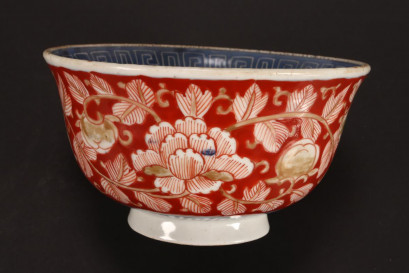 with slightly flared lip, the interior with a Greek key border, the exterior decorated with peony scroll in tones of red and gilt, raised on a circular foot, height 7cm, diameter 12cm -