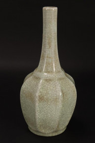of lobed baluster form with a faceted tapering neck, in light green glaze with suffused crackle finish, with hole to base, height 34cm -