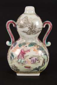 of double gourd form with twin scroll handles, decorated to front and back with two children playing in an outdoor setting, below a mountainous landscape scene, with floral decoration to sides, in tones of pink, green, blue and yellow, mark to base, height 8.5cm -