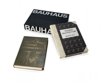 WINGLER, Hans M. The Bauhaus. Weimar, Dessau, Berlin, Chicago.Cambridge, MIT Press, 1969.24 colour plates, hundreds of illustrations, 653pp., folio, cloth slipcase. PERIODICAL - Architecture Berliner Architekturwelt. Zeitschrift fur Baukunst, Malerei, Plastik und Kunstgewerbe der Gegenwart. Vierter Jahrgang Berlin, Ernst Wasmuth, 1902. 20 plates, mostly colour litho, 2 folding, 588 numbered illustrations, 454pp. Some slight wear to tips and spine ends. Issued without advertisements or wrappers. August Endell's Wolzogen-Theater is illustrated with two plates and other illustrations on pp.378-395; TAUT, Bruno. Modern Architecture London, The Studio, (1929). Black & white photographs throughout, x, 212pp. (29.5x23.5cm), recent rebind in half vellum, pattern paper boards (Paul Nash repro). (3) -