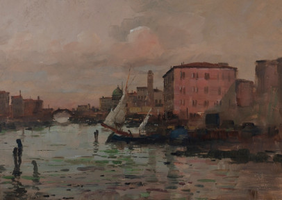 Lot Description:Lucio Cargnel (Italian 1903-1998) - River Scene with Boat and Bridge in Distance