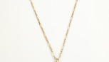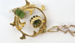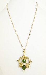 the 15ct gold pendant set with seed pearls and peridot, on 9ct rose gold chain. Length 42cm chain, 4.5cm pendant. Weight (all in) 6.8g. -