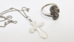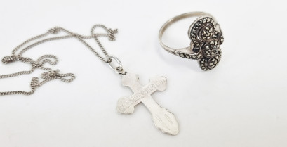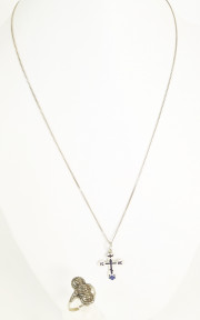 on sterling silver chain. Together with a vintage German silver and marcasite ring, size N. Weight (all in) 5.8g.