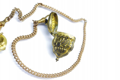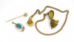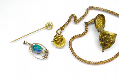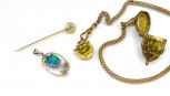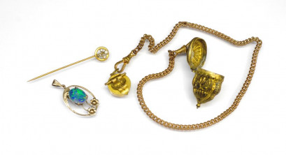 approx includes: "Rococo" box pendant, half Albert fob chain L:38cm, buckle pendant, opal triplet set 9ct Sil lined pendant, and a stick pin -