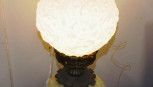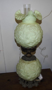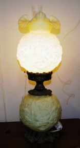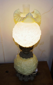 double circular milk glass shades, to brass framed electric lamp, with brass base, (height 56cm approx). -