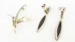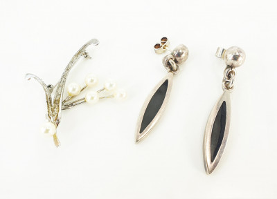 Lot #430 - A Pair of Mexican Taxco Sterling Silver and Enamel Drop Earrings and A Sterling Silver and Cultured Pearl Spray Brooch