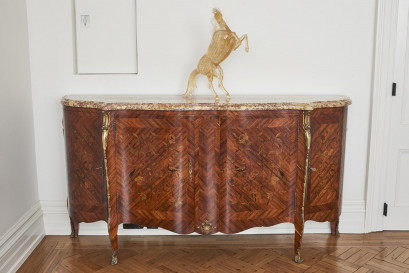 French, 19th Century fruitwood inlay, original marble top, with bronze mounts and feet