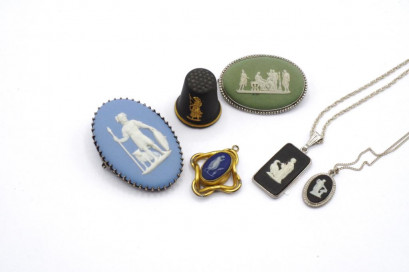 comprising 2 brooches set in silver, 2 pendants set in silver on silver chains, and a pendant set in gilt, together with a Wedgwood jasperware thimble -