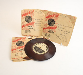 Five 'Voices of the Forces' postal records. Four with envelopes. Dating to 1945. These postal records were bought from NAAFI shops by British Service men and women serving overseas. They would then take the record to a visiting E.N.S.A. Engineer and record a message which would be posted in a supplied envelope to relatives. Record 13.5 cm (d). -