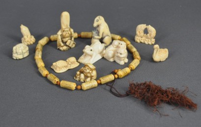 10 various netsuke incl. boy, lion & cub; frog & 7 others (most signed to base); & string of carved bone hand beads with silk tassel attached.