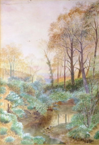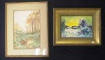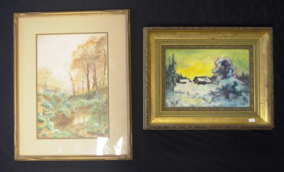 watercolour on paper, signed lower right, 36cm x 24cm together with Artist unknown, oil on canvas, winter landscape, unknown signature lower right -