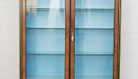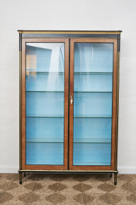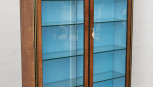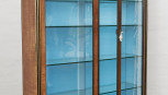a pair of glass doors flanked by fluted columns, sky blue silk lined interior and five glass shelves, on tapered fluted legs, interior with LED down lights