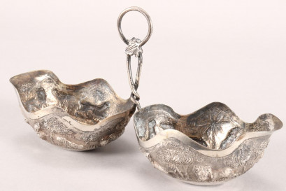 each bowl decorated with repousse figures engaged in hunting scenes, with shaped rims and leaf form loop handle, total weight 167gm, height 12cm and width 22cm -