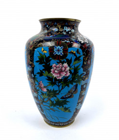 Lot Description:A Large Antique Japanese Cloisonne Baluster Vase Depicting Ornate Floral, Bird & Butterfly Motifs