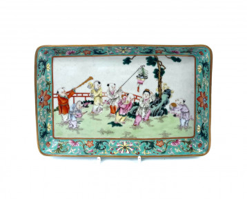 Lot Description:An Antique Chinese Porcelain Rose Famille Trinket Tray Depicting Children Playing