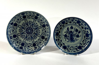 Lot Description:Two Chinese Blue & White Dishes Depicting Central Lotus & Chrysanthemum Motifs