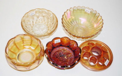 Lot Description:Four carnival glass bowls & a flower frog